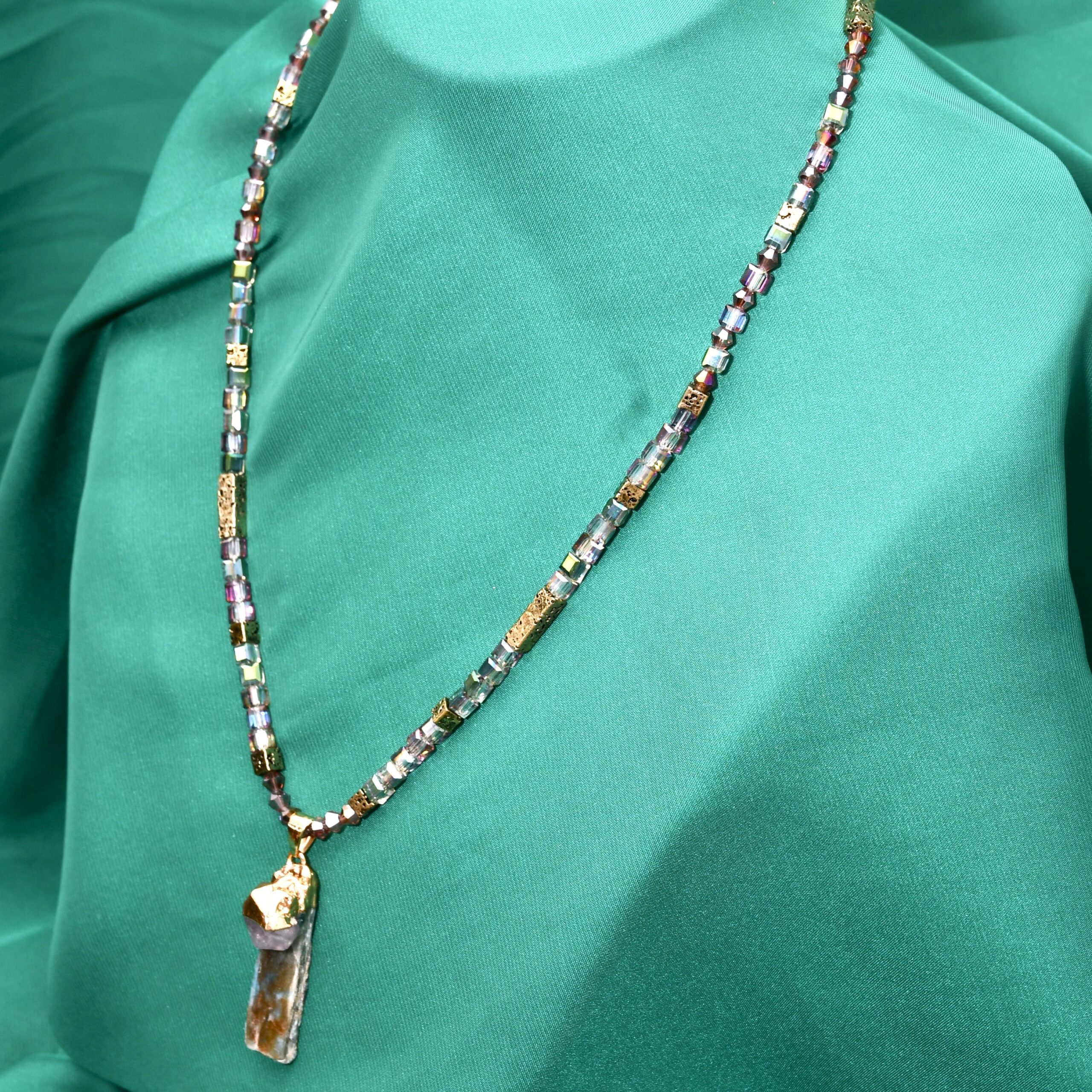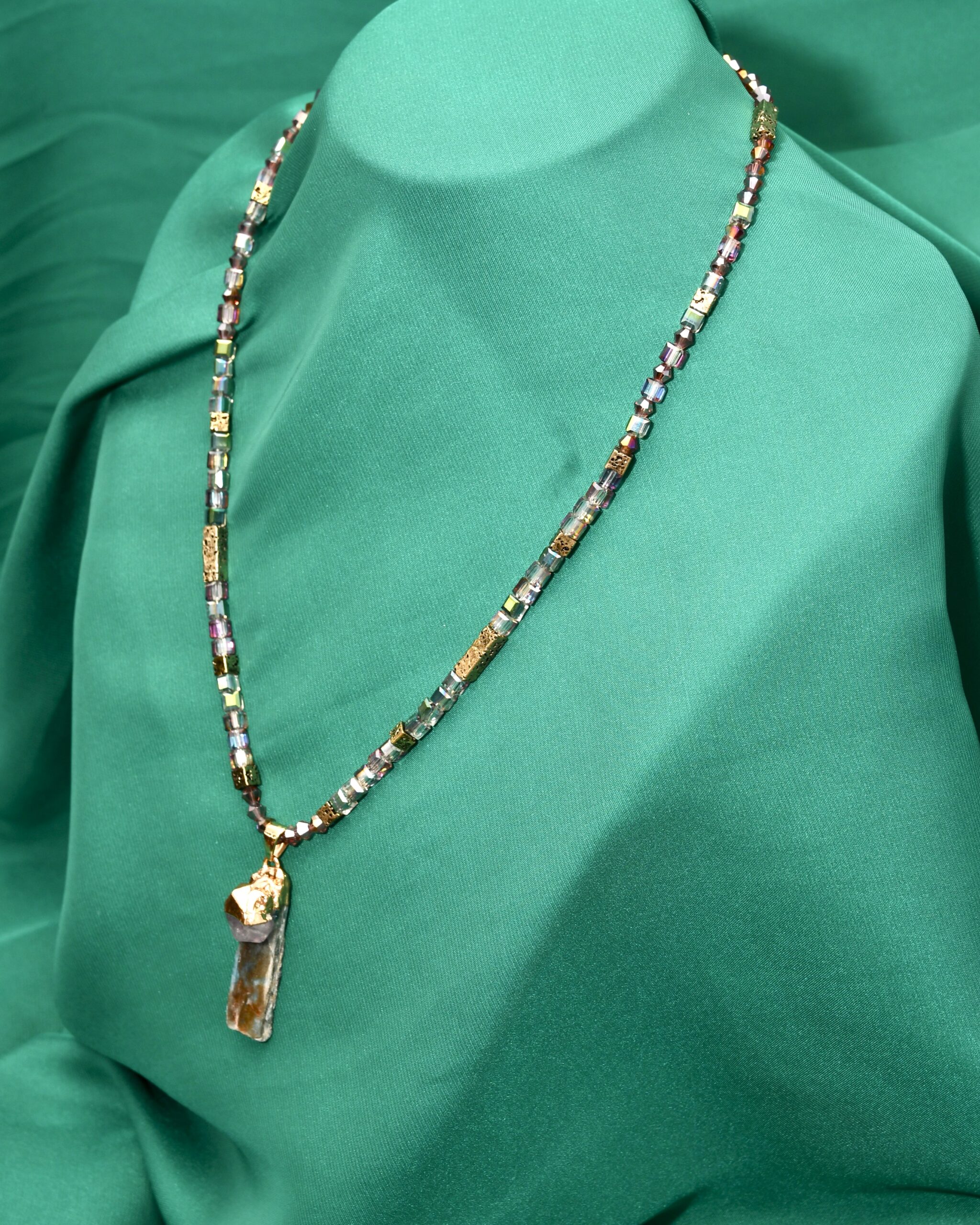 Ova unikatna energetska ogrlica kombinuje moć uzemljenja i duhovnog uzdizanja. Ručno izrađena od hematita u pozlati, sa upečatljivim priveskom od kijanita i ametista, ona je savršen spoj elegancije i spiritualne funkcije.