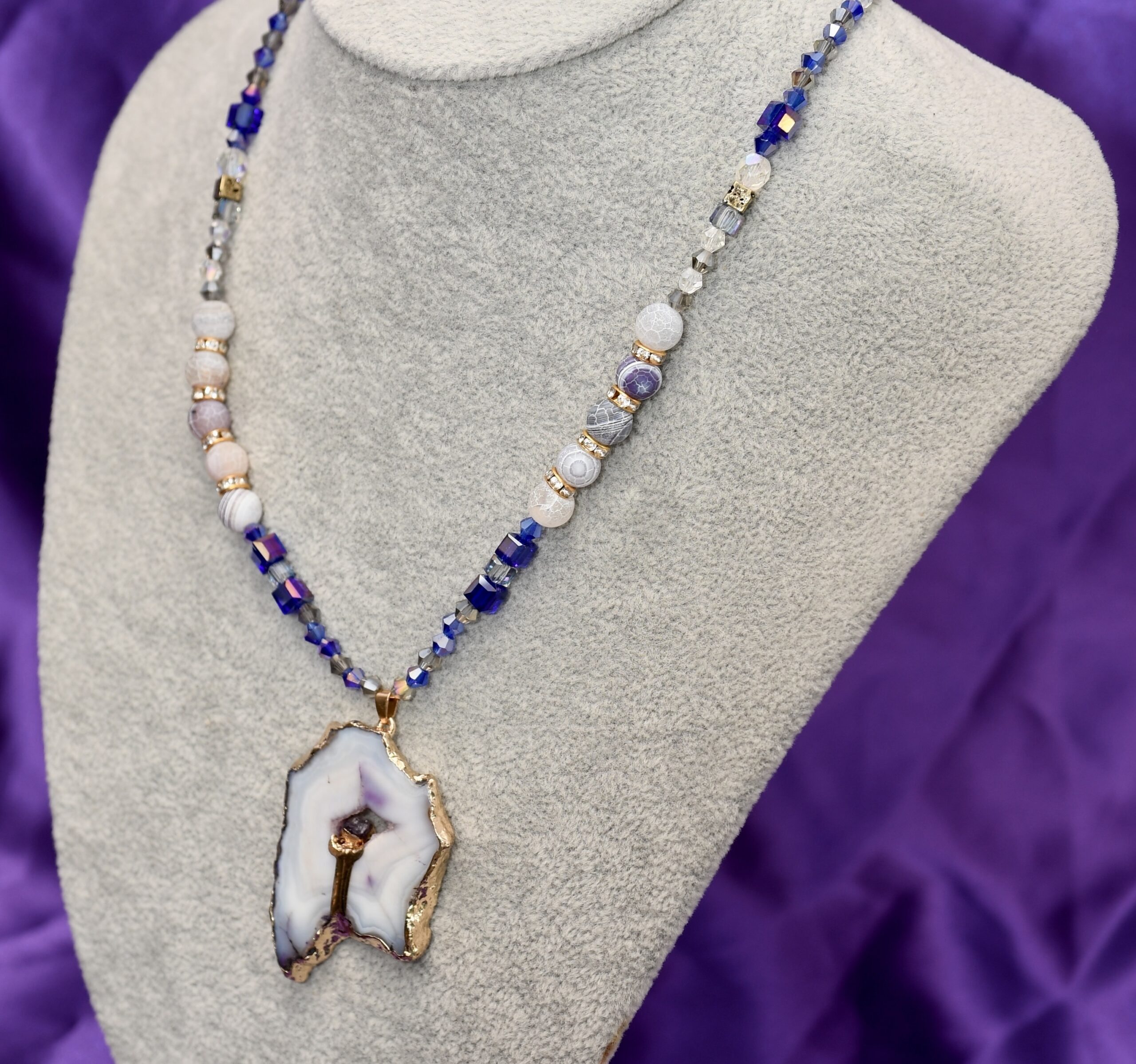 Ova unikatna ogrlica je energetski snažan komad koji kombinuje druzy kristal sa ametistom u pozlati, jaspis – kamen stabilnosti i unutrašnje snage, i visokovibracione Andara kristale, poznate po svojim transformativnim svojstvima.
