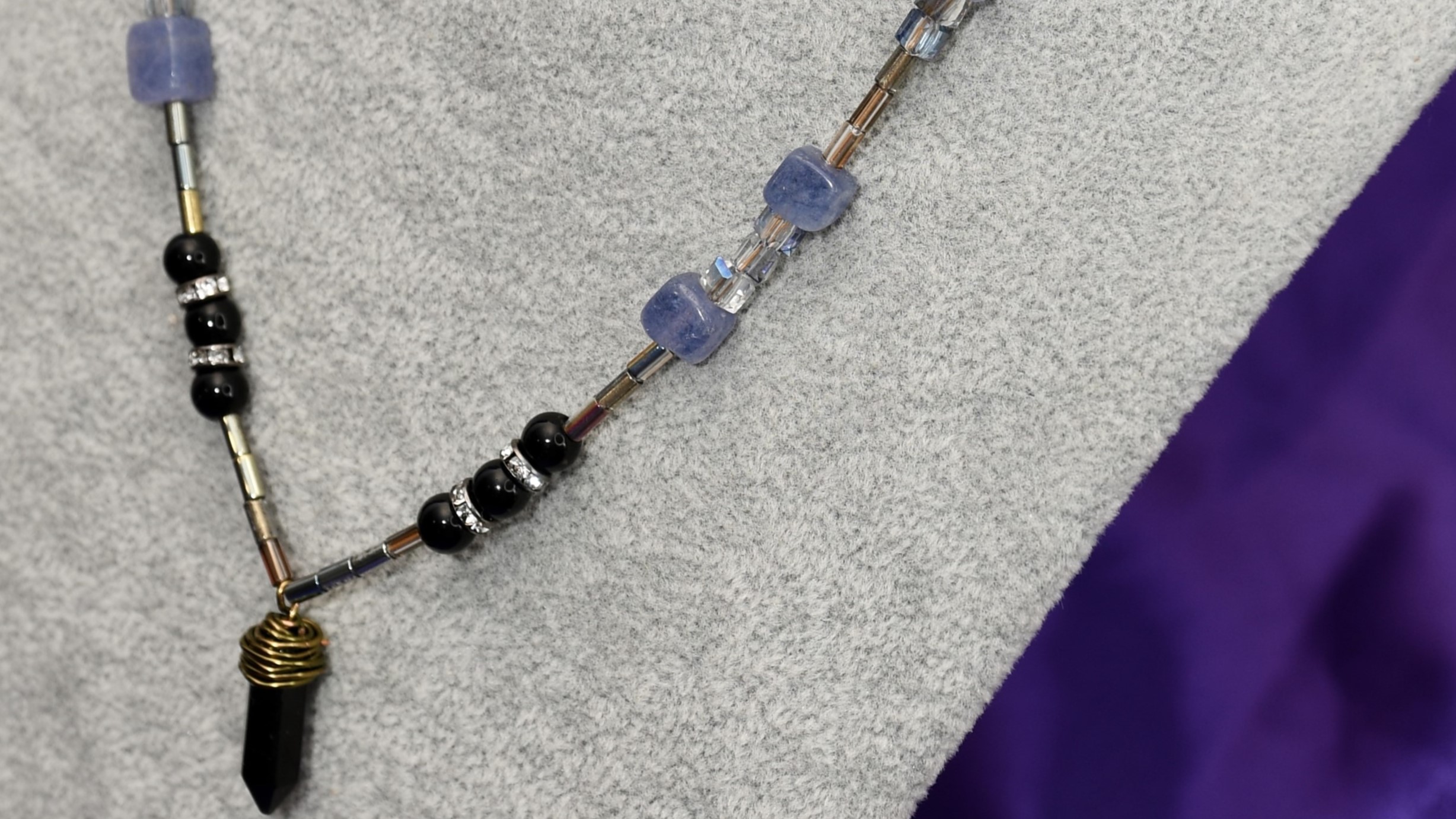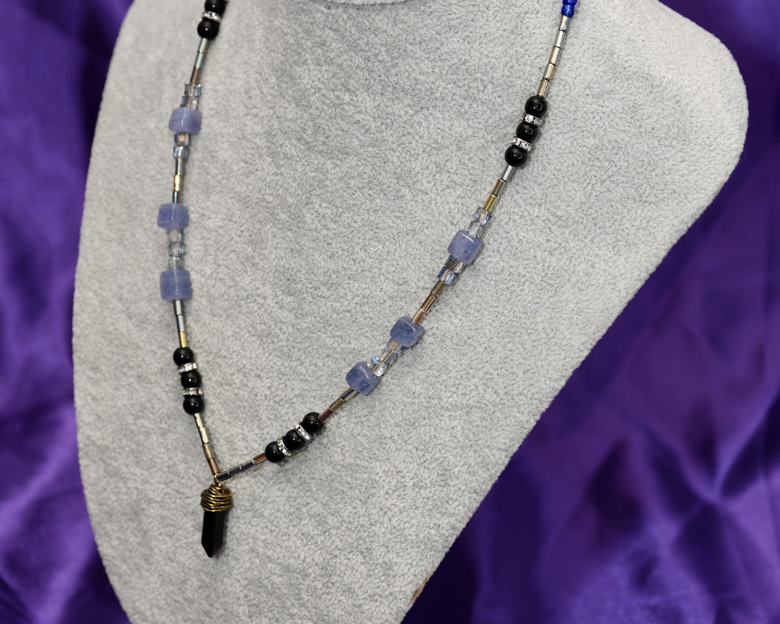 Ova unikatna ogrlica spaja sirovu snagu prirodnih kristala i umetnost žičanog omotavanja. Plavi turmalin donosi jasnoću misli i emotivnu stabilnost, dok oniks, pažljivo ručno omotan bakarom, pruža zaštitu i unutrašnju snagu. Perle dodaju mekoću i estetsku ravnotežu.