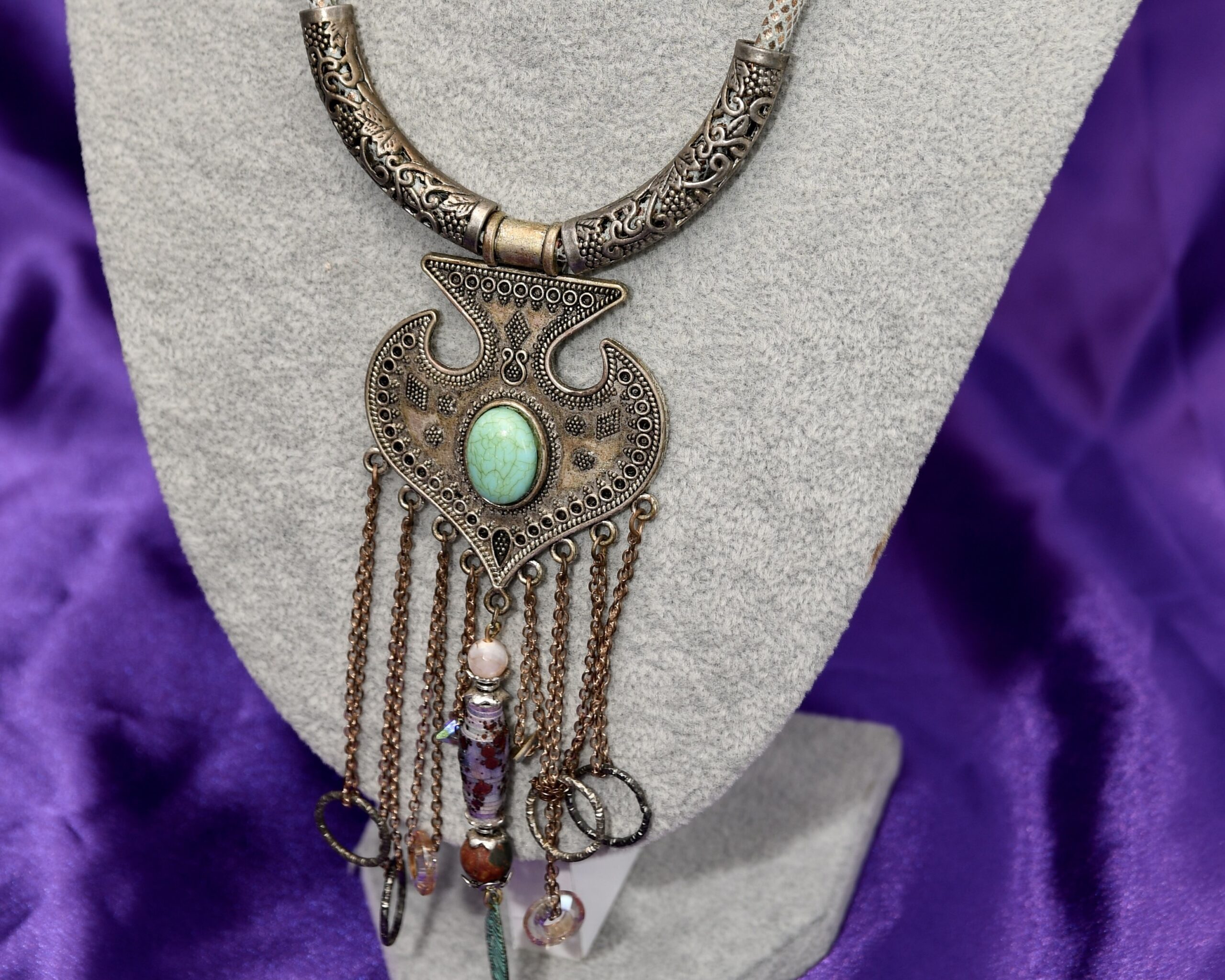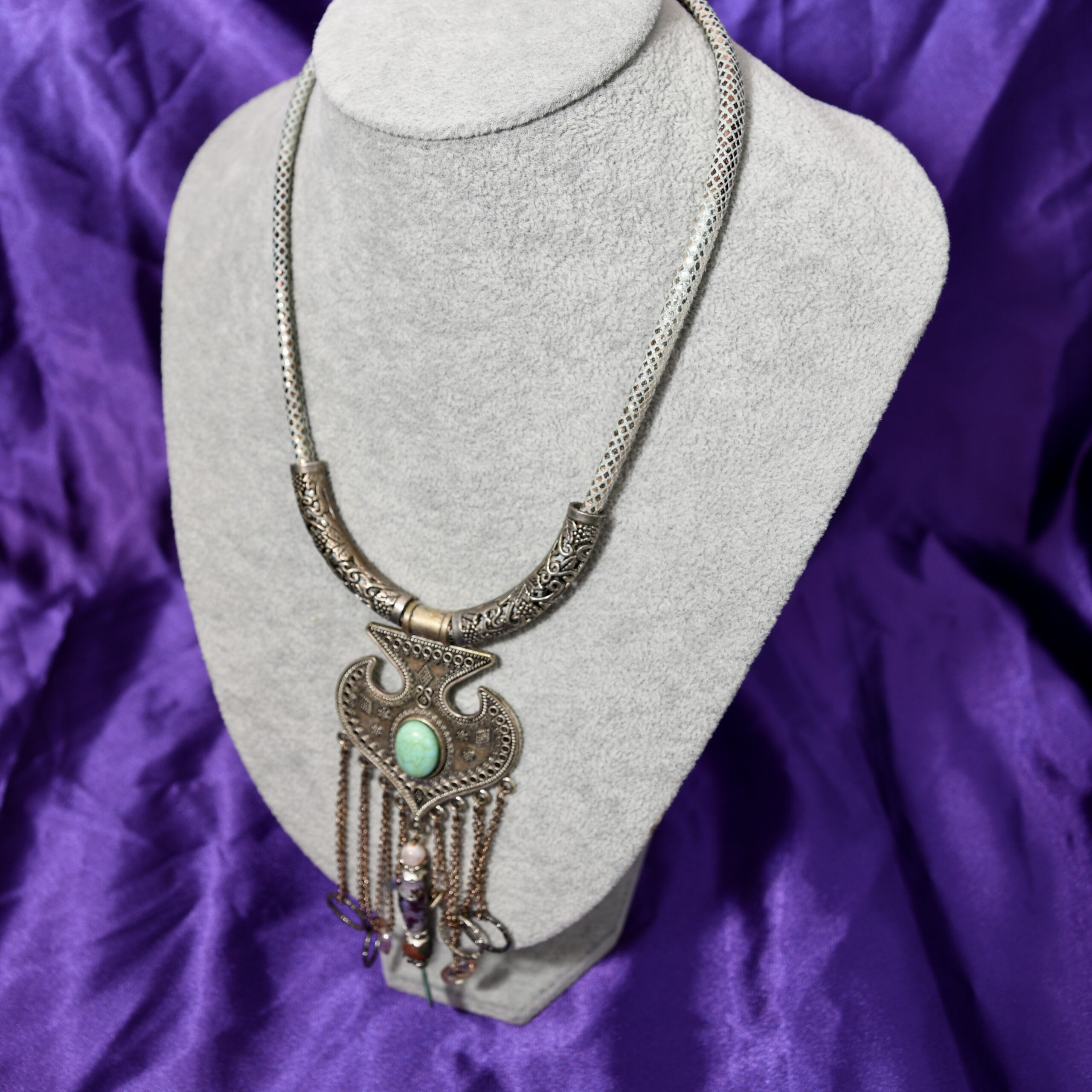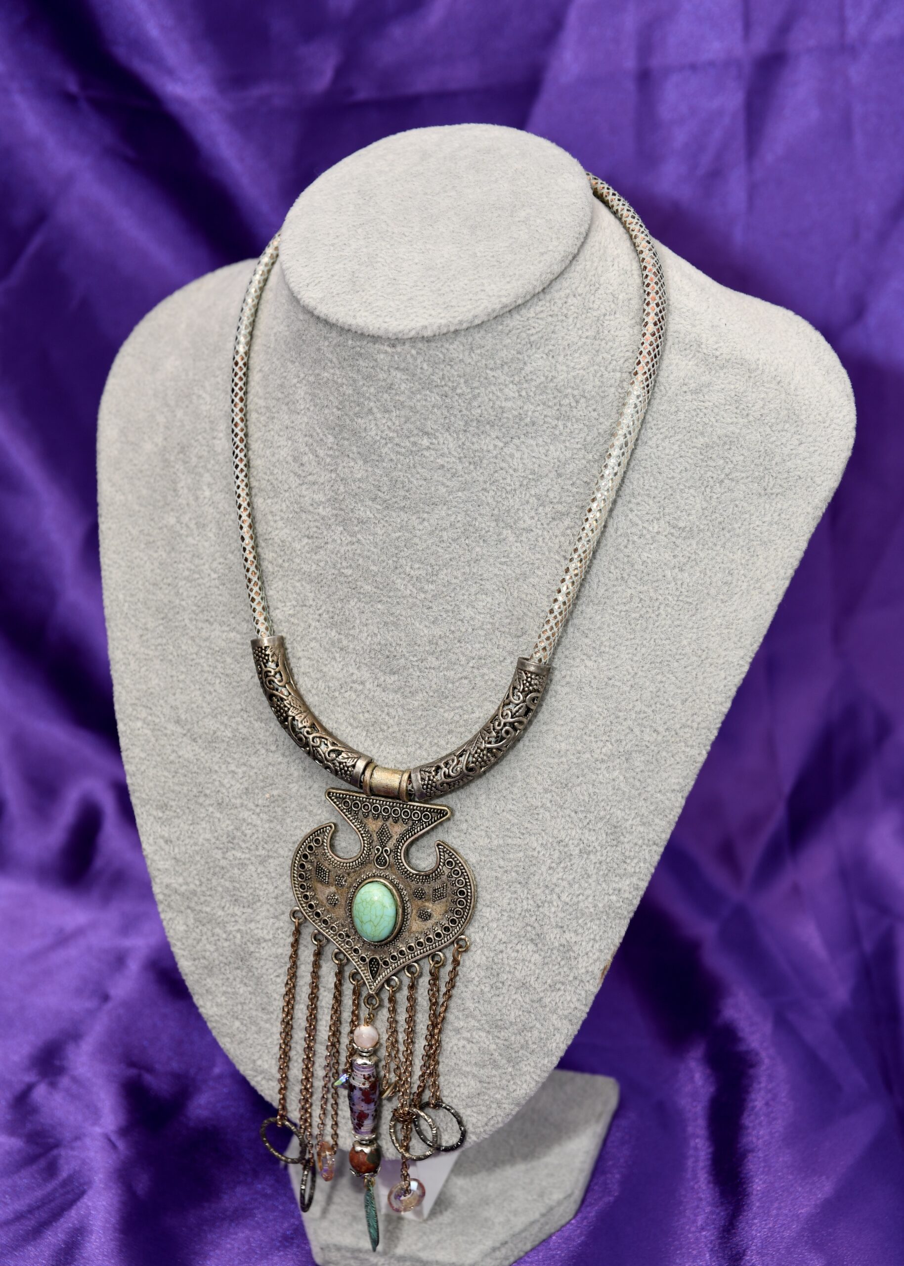 Unikatna statement ogrlica od kože, amazonita, svilenih perli i tibetanskog srebra | energetska zaštita